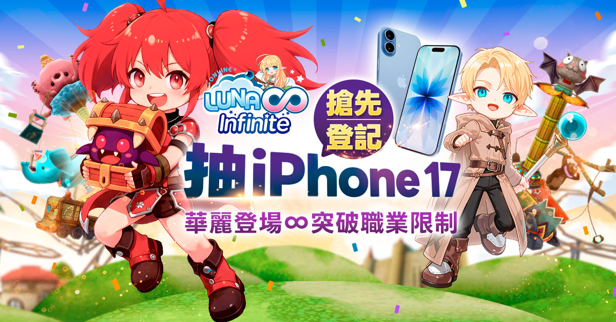 《LUNA Infinite》預登錄活動自11月4日(二)下午3點至11月16日(日)晚上11:59止。完成預約的玩家立即可獲得遊戲專屬虛寶大禮包,包含角色養成道具、鑽石等豐富獎勵。此外,官方更祭出超級大獎iPhone17抽獎,參與預約就有機會把最新旗艦手機帶回家!