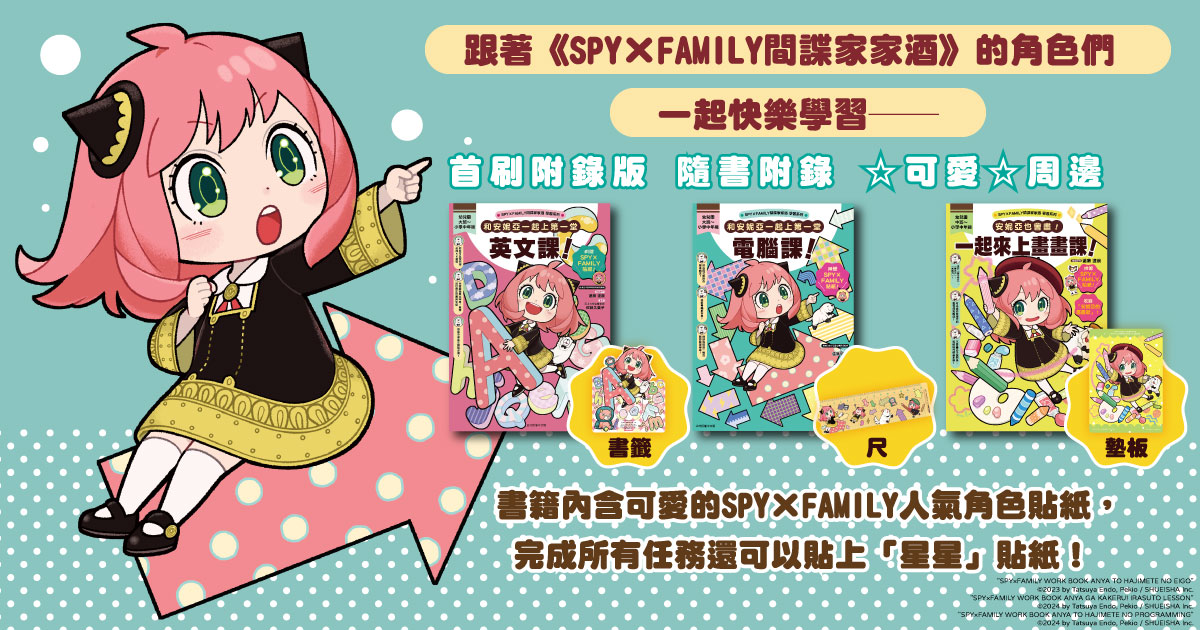 全球熱賣的漫畫作品《SPY×FAMILY間諜家家酒》,這次推出專為小朋友設計的入門學習書系列!分別是「畫畫課」、「英文課」、「電腦課」,書籍內含可愛角色貼紙,首刷附錄版更是附上墊板、尺、書籤!於東立官網可以試閱精彩內容,趕快讓我們一起看看《SPY×FAMILY間諜家家酒學習系列》的豐富內容吧!