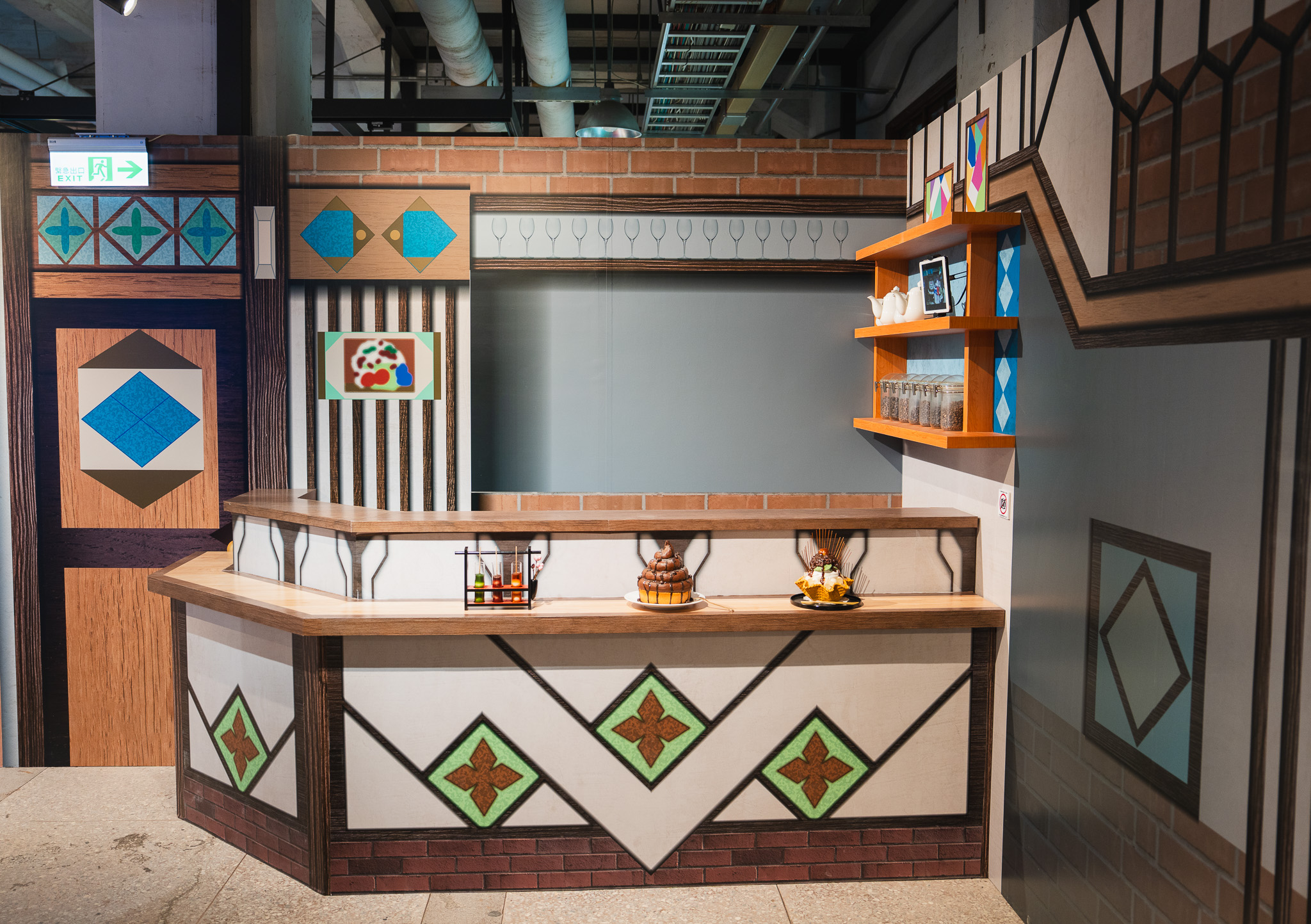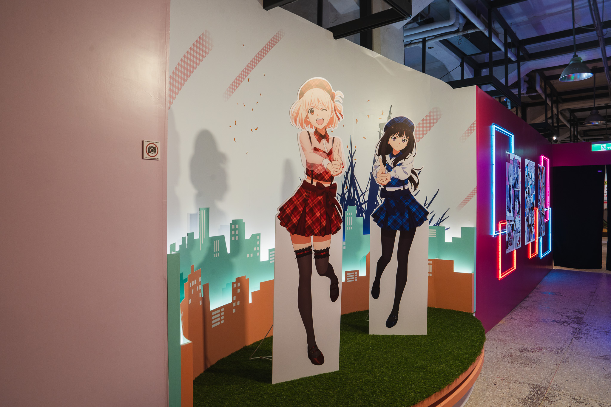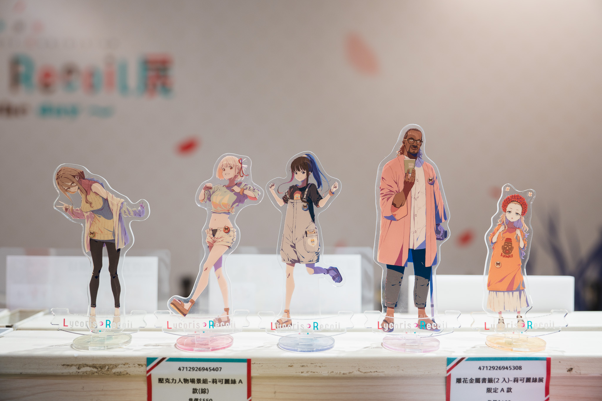 本次展覽以作品核心場景「LycoReco 咖啡廳」作為開頭,依動畫原畫比例重現櫃檯、窗格與室內氛圍,從牆面配色到擺設都忠於原作。粉絲踏入即能感受到千束、瀧奈的日常與任務之中,而最強駭客Walnut的壁櫥工作站,也以立體造景呈現,忠實還原動畫中場景。