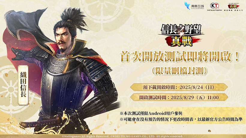 《信長之野望 真戰》首次限量刪檔測試將於 8 月 29 日展開,Android 玩家現已可於 Google Play 完成預先下載。名額有限,額滿即止。更多活動細節與後續情報,請持續關注官方粉絲團公告。